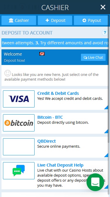 Banking銀⾏業務選項 的 Spinfinity Casino