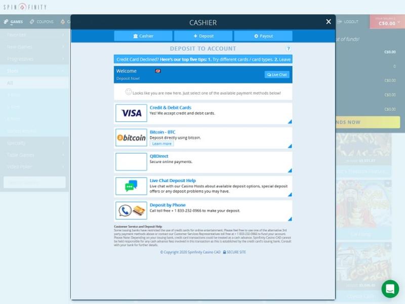 Spinfinity 的銀行服務還不錯,儘管它有一些迎合美國人的常見缺點。如果你使用比特幣等加密貨幣,付款時間會比較短,但使用銀行轉帳或信用卡付款則需要更長。每週的獎金提現限額為 4,000 美元,如果你贏了大錢,這個限額可能會有點失望。