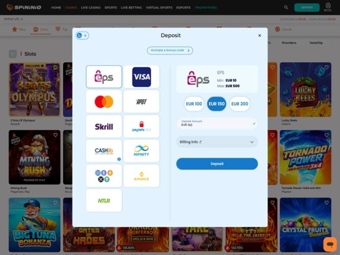 Spininio 線上賭場成立於 2026 年初,歡迎來自加拿大、德國、奧地利和瑞士等國的玩家,提供種類繁多的賭場遊戲和體育博彩選項,包括數千款真錢老虎機、真人荷官、桌面遊戲和碰撞遊戲,同時還擁有完善的促銷計劃,包括獎金、促銷和錦標賽。