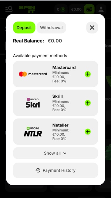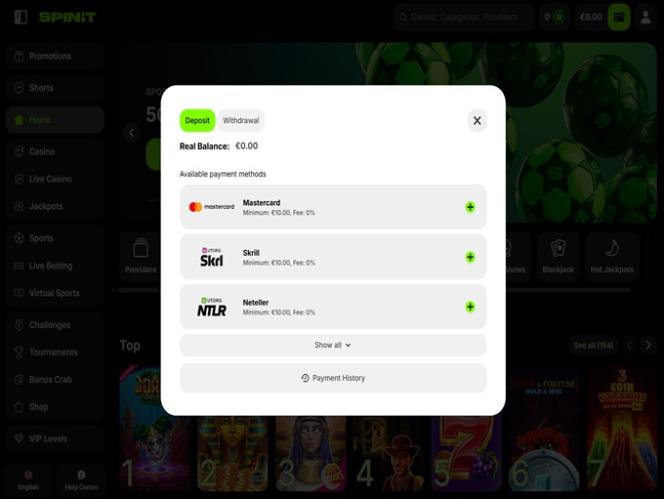 如果您想在 Spinit Casino 存款和提款,您可以使用多種支付方式。選項包括Visa 、萬事達卡、銀行電匯、 Skrill 、 Neteller 、 Paysafecard和MiFinity ,以及比特幣、比特幣現金、卡爾達諾、狗狗幣、萊特幣、 USD Coin 、泰達幣和瑞波幣等加密貨幣。