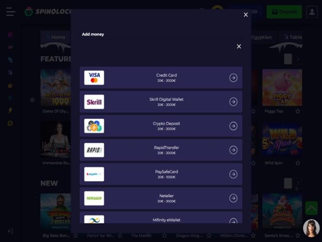 Spinoloco 賭場以提供多種付款方式供玩家管理餘額而聞名。傳統支付方式包括Visa 、 Mastercard 、 Apple Pay 、 Google Pay 、銀行電匯、 Neteller 、 Neosurf等。而現代支付方式則包括比特幣、比特幣現金、狗狗幣、以太坊、萊特幣和泰達幣等加密貨幣。