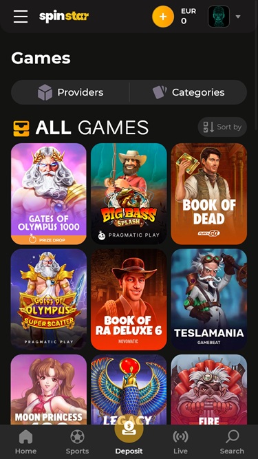 遊戲類別包括老虎機、熱門新遊戲、現場遊戲、原創遊戲、累積獎金等。如果您對現場賭場部分感興趣,在這裡您會找到玩家最喜歡的頂級遊戲。