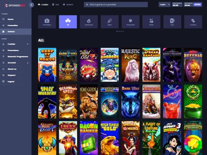 如果您是線上老虎機的愛好者,那麼在 SponsioBet 賭場玩遊戲絕對樂趣無窮。我們強烈建議您嘗試以下一些熱門遊戲: Mask of Amun、Reel King Mega、Dynamite Riches Megaways、Rich Wilde and the Book of Dead、9 Pots of Gold、ThunderStruck Stormchaser、Fisherman Fury Bonanza、Highways Legends、Rise of Olympus 100、900k Masks、Bake Powers、Acoco、cocococoon、BStar、Bek、Bek、Bek、Bek、Bek) Burn、Big Egyptian Fortune、Football Finalx XUP 和 Rock Bottom。
