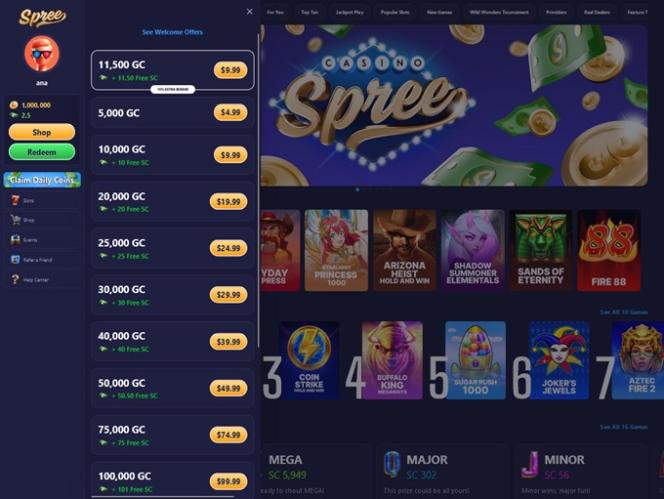 Spree Casino 提供兩種玩家常用的虛擬貨幣:金幣和 Spree Coins。金幣可以免費獲得,也可以直接從網站商店購買。金幣可用於娛樂,除了可以購買外,還經常在各種活動和促銷活動中贈送。
