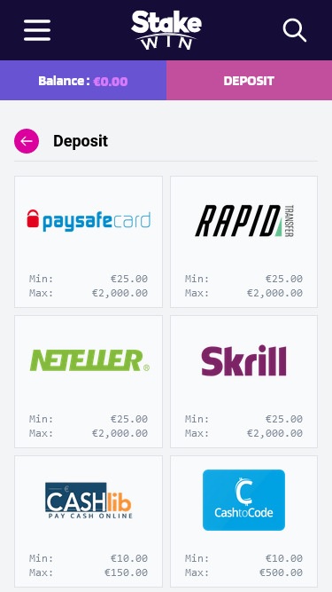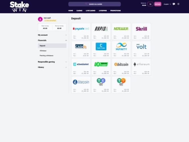 StakeWin Casino 的出納員支援流行的數位貨幣和加密支付選項以及眾多廣泛使用的傳統銀行業務方法,包括借記卡和信用卡支付卡、銀行電匯、電子錢包以及其他支付系統。