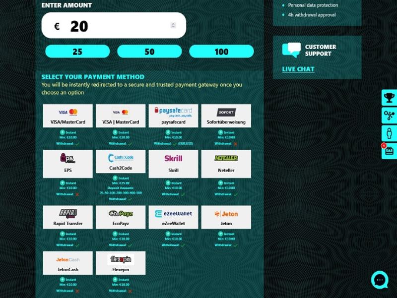 說到銀行業務,我們提供的選項非常豐富,比我們在許多其他線上賭場看到的選項還要多。您可以透過萬事達卡、Visa、Skrill 等多種方式存款。如果您願意,也可以選擇使用 Neteller 或加密貨幣存款。