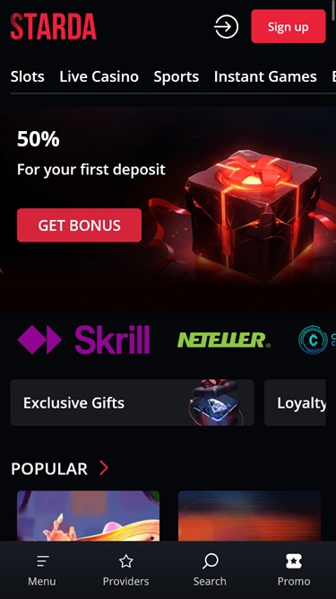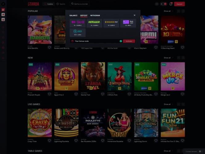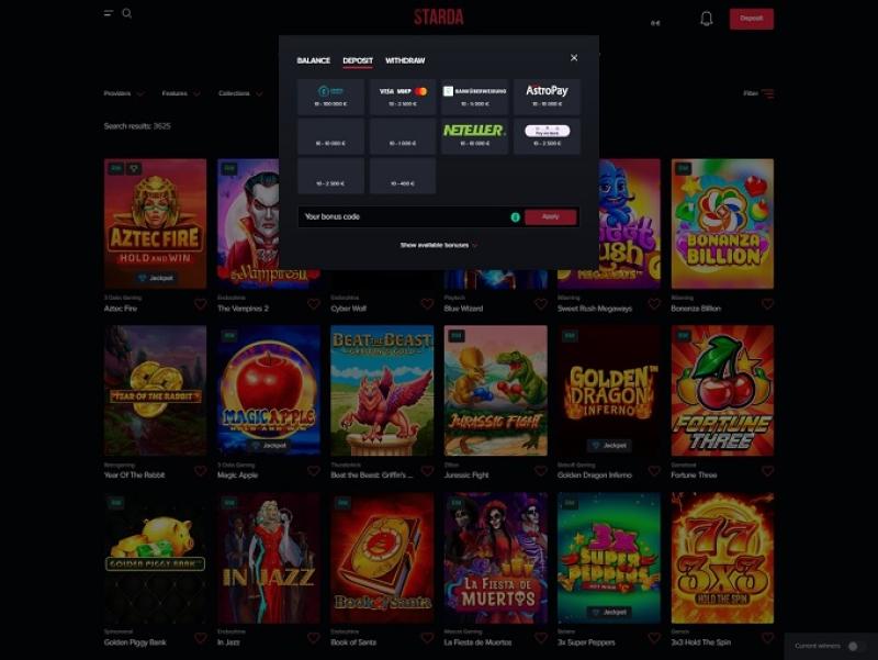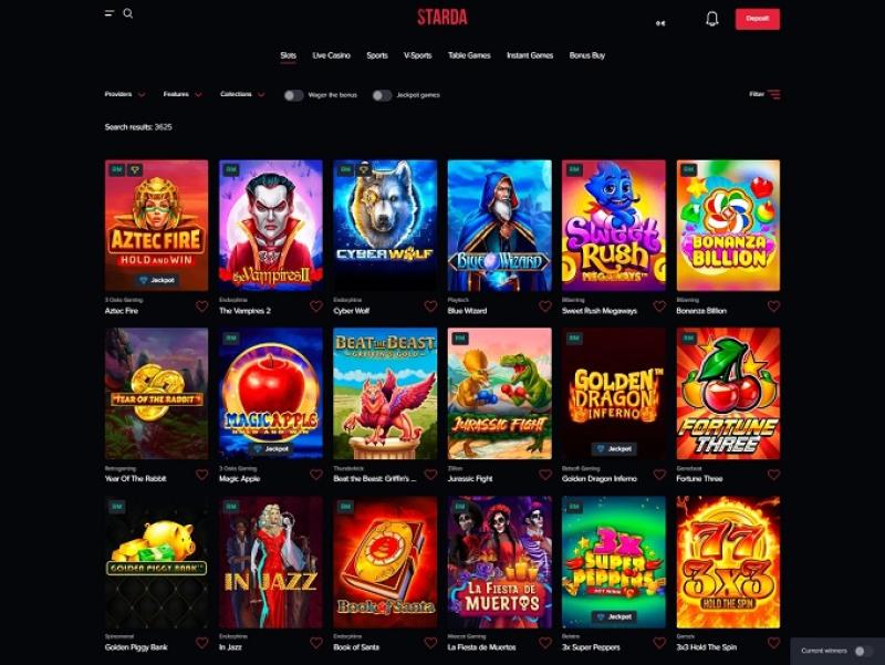 正如我們所提到的,這家經驗豐富的營運商與世界著名的線上賭場軟體開發商合作,提供一流的遊戲內容。 Starda 的產品組合包括引人入勝的賭場遊戲,從線上老虎機到真人荷官遊戲,為所有類型的玩家提供卓越的遊戲體驗。