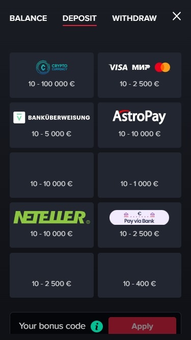 該賭場為玩家提供多種存款和提款方式。會員可以選擇支付卡、電子錢包、電匯和加密貨幣銀行服務,這些服務近年來越來越受玩家歡迎。