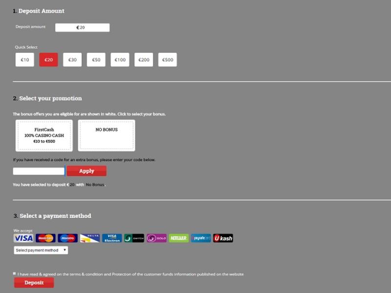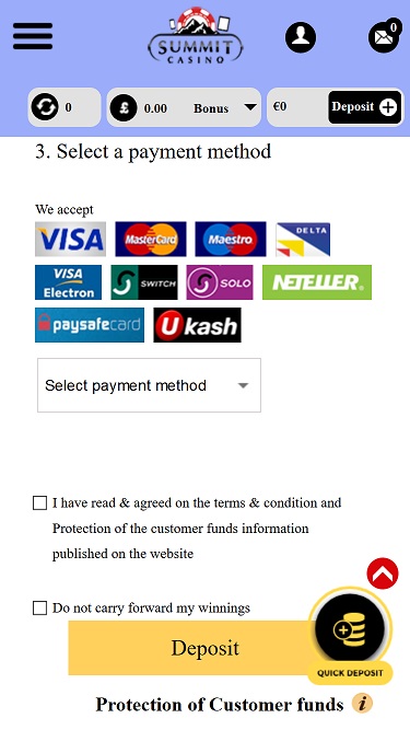 Summit Casino 的條款和條件中沒有任何不公平或掠奪性的內容。 Summit Casino 的銀行系統比我預期的要慢一些,付款時間可能需要 7-10 個工作天。在英國這樣一個競爭激烈的市場,這實在是太慢了,我希望速度問題能盡快解決。提款和存款可以透過 Visa、Maestro、Solo 和 Neteller 進行,存款也可以透過 Boku、Paysafecard 和 MasterCard 進行。提款也可以透過支票或銀行電匯支付。Banking銀⾏業務選項 的 Summit Casino