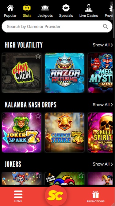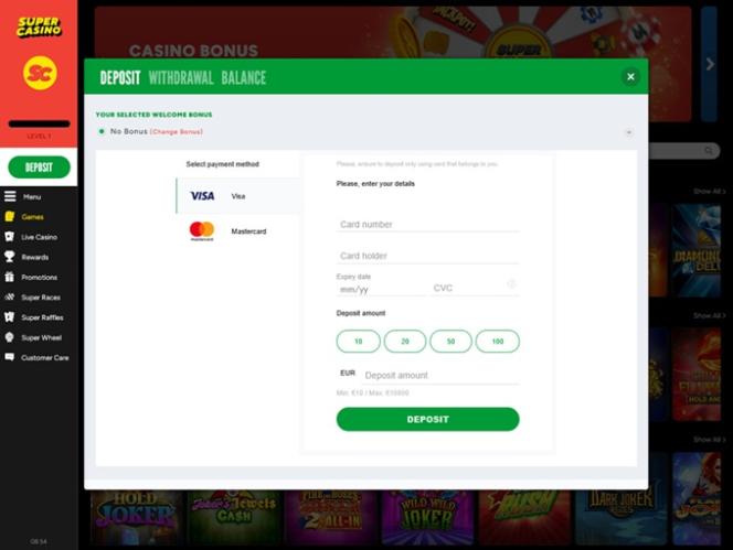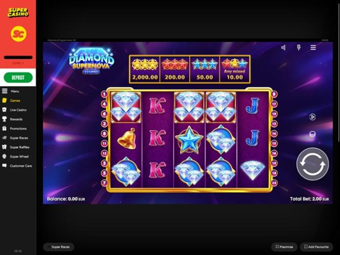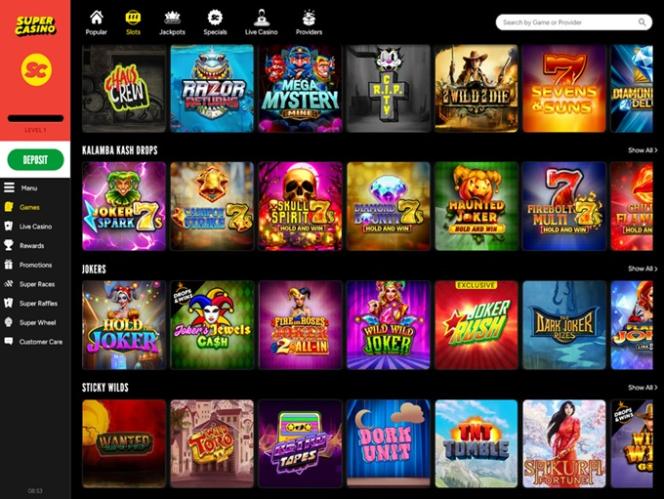 SuperCasino 由 Amaya, Microgaming, Net Entertainment, 1x2gaming, Barcrest, Big Time Gaming, ELK Studios, Evolution Gaming, iSoftBet, lightningboxgames, Novomatic, Oryx, Play'n GO, Quickspin, Relax Gaming, Thunderkick, Yggdrasil, Endorphina, Wazdan, Booming Games, Stakelogic, Pragmatic Play, Nolimit City, Felt Gaming, Red Tiger Gaming, Spinomenal, Skillzzgaming, Fantasma Games, FunFair, Kalamba, Triple Edge Studios, Northern Lights Gaming, Evoplay, Stormcraft Studios, Switch Studios, Electric Elephant Games, Pocket Games Soft, Bulletproof Games, All41 Studios, Gluck Games, Gameburger Studios, Neon Valley Studios, Golden Rock Studios, Spearhead Studios, Swintt, SpinPlay Games, HungryBear Gaming, SmartSoft Gaming, Real Dealer Studios, Blue Guru Games, On Air Entertainment, Elysium Studios, Games Global, 2by2 Gaming, Bally Technologies, bluberi, Blueprint Gaming, Greentube, NextGen, Push Gaming, Tom Horn Gaming, WMS, Inspired Gaming, Gaming Realms, SG Interactive, Gamomat, Red7Mobile, Scientific Games, Side City Studios, Reel Time Gaming, Iron Dog Studio, Old Skool Studios, Foxium, Just For The Win, Reflex Gaming, PearFiction Studios, Slingshot Studios, Golden Hero, Fortune Factory Studios, STHLM Gaming, 4ThePlayer, AvatarUX, Gamevy, Crazy Tooth Studio, NetGaming, ReelPlay, Japan Technicals Games, Alchemy Gaming, Black Pudding Games, Snowborn Games, Boomerang Studios, Hacksaw Gaming, Max Win Gaming, Gold Coin Studios, Bang Bang Games, Half Pixel Studios, Slotmill, SilverBack Gaming, Peter And Sons, Aurum Signature Studios, Lucksome Gaming, Leap Gaming, Apparat Gaming, Circular Arrow, INO Games, Atomic Slot Lab, Neko Games, Reel Kingdom, Oros Gaming, Indigo Magic, Light & Wonder and Sneaky Slots提供支持,其遊戲透過基於網頁的即時遊戲平台提供,似乎摒棄了許多 Playtech 賭場提供的可下載軟體。 SuperCasino 還支援行動遊戲,讓玩家可以透過智慧型手機或平板電腦玩遊戲。