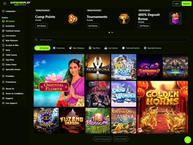 Supreme Play Casino 由 BetSoft, Genesis Gaming, Rival, Saucify, Vivo Gaming, Spinomenal, Felix Gaming, Fugaso, Radi8 Games, Fresh Deck Studios, Woohoo Games, Qora Games, SmartSoft Gaming, Tom Horn Gaming, Genii, Wager Gaming, Dragon Gaming and Dragoon Soft提供支持,這兩個平台在老虎機體驗比這裡好得多的賭場都能找到。玩家可以透過可下載的用戶端軟體以及網頁平台存取賭場。其他遊戲