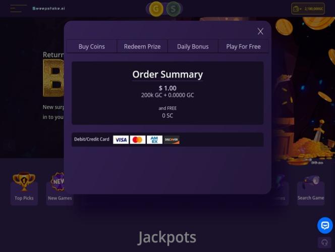 與許多其他社交賭場一樣,Sweepstake.ai 允許玩家透過多種方式賺取金幣和抽獎幣。金幣可以透過迎新獎金、贈品、累積獎金、每日獎勵、促銷活動或遊戲獲得。金幣可以直接在網站上購買,但不能兌換現金獎勵或禮品卡。