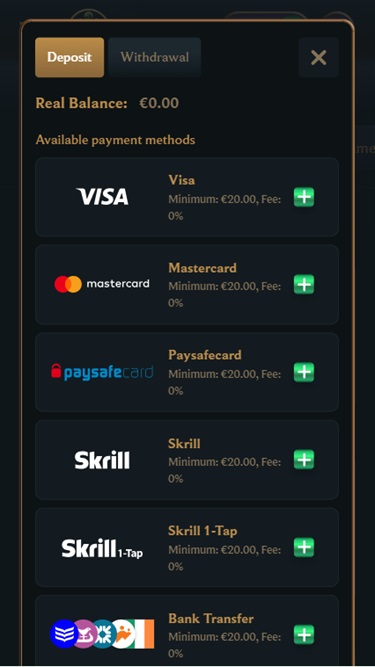 賭場的出納員支援多種傳統和加密貨幣支付方式。請注意,可用的選項取決於您所在的國家/地區,但無論您身在哪個博彩管轄區,都有多種流行的存款和提款方式可供選擇。銀行頁麵包含一個下拉式選單,您可以在其中選擇您所在的國家/地區和貨幣,以查看您所在地區所有可用的選項,並明確規定了每種選項的限額。