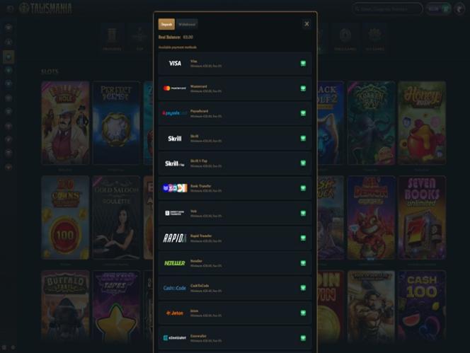 Banking銀⾏業務選項 的 Talismania Casino