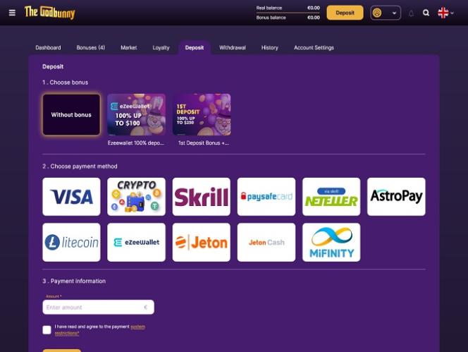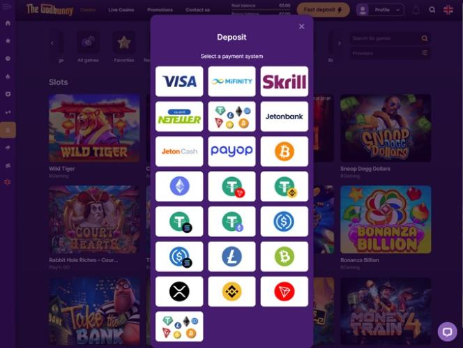 至於銀行選項,Godbunny 賭場為玩家提供多種支付方式,例如 Visa、MasterCard、 Skrill、Neteller 、Paysafecard、AstroPay、Jeton 等等。營運商還允許玩家使用加密貨幣作為主要支付方式。
