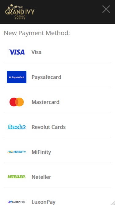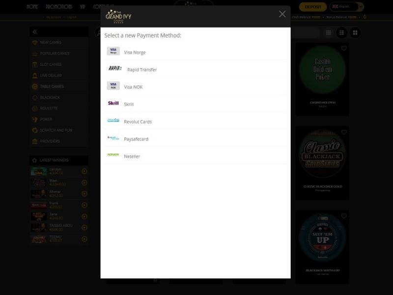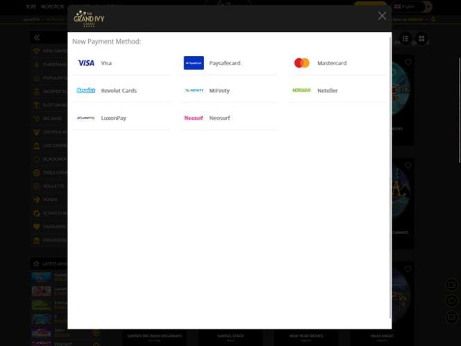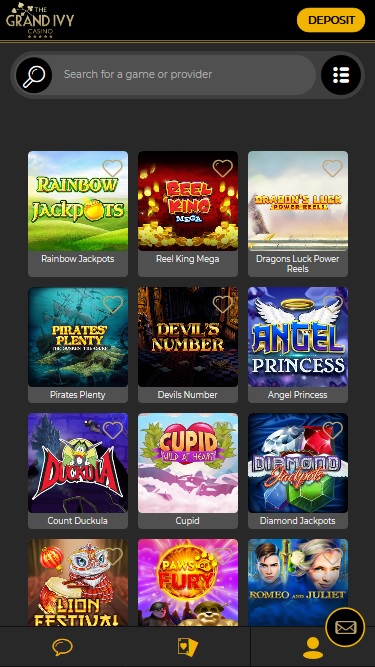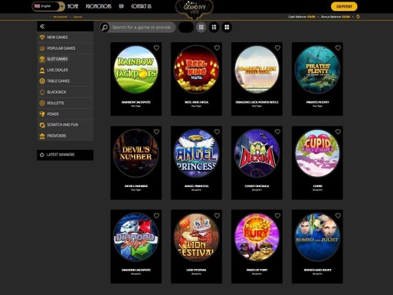Grand Ivy 賭場由 Microgaming, Net Entertainment, 1x2gaming, Barcrest, Big Time Gaming, ELK Studios, Evolution Gaming, EYECON, Ezugi, lightningboxgames, Oryx, Play'n GO, Rabcat, Relax Gaming, Thunderkick, Wazdan, Realistic Games, Stakelogic, Pragmatic Play, Nolimit City, Felt Gaming, Red Tiger Gaming, IGT, Spinomenal, Fantasma Games, SYNOT Games, Kalamba, Revolver Gaming, Skywind, Spinmatic, Triple Edge Studios, Northern Lights Gaming, Stormcraft Studios, Switch Studios, Electric Elephant Games, Pocket Games Soft, All41 Studios, Gluck Games, Gameburger Studios, Pulse 8 Studios, Neon Valley Studios, Golden Rock Studios, Spearhead Studios, Swintt, Shuffle Master, SpinPlay Games, HungryBear Gaming, GONG Gaming, Blue Guru Games, Lady Luck Games, Buck Stakes Entertainment, Design Works Gaming, Games Global, 2by2 Gaming, Ainsworth, Bally Technologies, Blueprint Gaming, Endemol Games, Greentube, Leander Games, Merkur Gaming, NextGen, NYX Interactive, Push Gaming, Tom Horn Gaming, WMS, Inspired Gaming, Gaming Realms, SG Interactive, Red7Mobile, CORE Gaming, Scientific Games, Side City Studios, Reel Time Gaming, Authentic Gaming, Iron Dog Studio, Old Skool Studios, Foxium, Betdigital, Just For The Win, Storm Gaming Technology, PearFiction Studios, Apollo Games, Wild Streak Gaming, Slingshot Studios, Fortune Factory Studios, Jade Rabbit Gaming, 4ThePlayer, AvatarUX, Gamevy, Crazy Tooth Studio, NetGaming, High 5 Games, ReelPlay, AGS Interactive, Alchemy Gaming, Black Pudding Games, Hacksaw Gaming, Max Win Gaming, Gold Coin Studios, Half Pixel Studios, SilverBack Gaming, Peter And Sons, Eurostar Studios, Aurum Signature Studios, Armadillo Studios, Lucksome Gaming, Area Vegas, RAW iGaming, Leap Gaming, Wishbone Games, Spribe, Circular Arrow, Print Studios, Gaming Corps, HammerTime Games, Four Leaf Gaming, INO Games, Nailed It! Games, Live 5, Atomic Slot Lab and Neko Games提供支持,其遊戲透過基於網頁的即時遊戲平台提供,玩家可以透過網頁瀏覽器註冊、存款和玩遊戲。此外,賭場還提供功能豐富的行動網站,讓玩家可以使用智慧型手機和平板電腦玩遊戲。