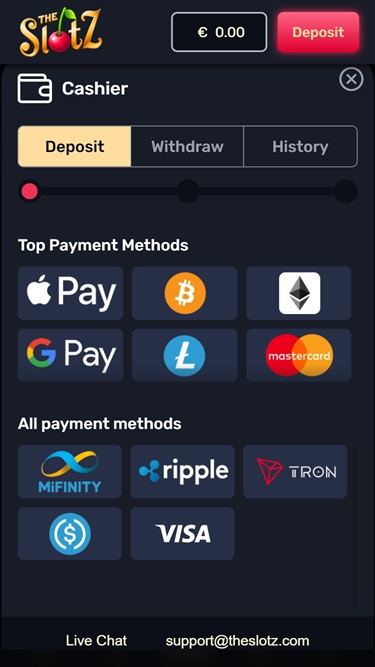 TheSlotz 賭場支援多種支付方式,提供傳統和現代的存款和提款選項。部分特色支付方式包括Visa 、Mastercard、 Apple Pay 、Google Pay、Jeton、MiFinity,以及比特幣、以太幣、萊特幣等加密貨幣。