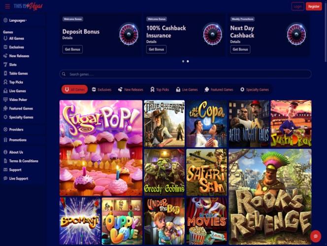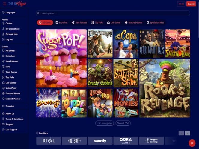 ThisIsVegas 賭場由 BetSoft, Genesis Gaming, Rival, Saucify, Arrows Edge, Radi8 Games, Fresh Deck Studios, Woohoo Games, Qora Games, Genii and Dragon Gaming提供支持,這使得賭客有機會透過可下載的軟體以及讓您可以透過網路瀏覽器玩遊戲的即時播放模式來玩賭場的遊戲。Slot machines