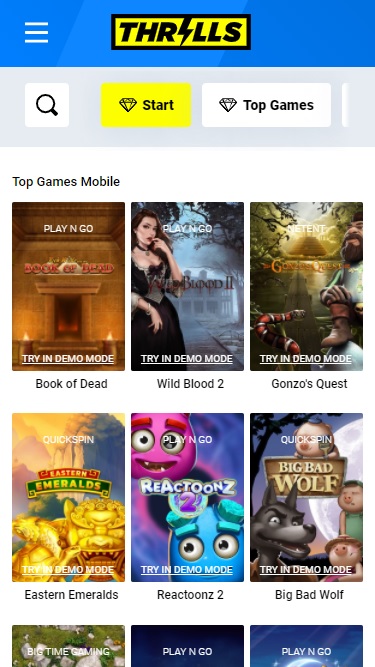 Thrills Casino 由 Microgaming, Net Entertainment, 1x2gaming, Barcrest, Big Time Gaming, ELK Studios, Evolution Gaming, lightningboxgames, Play'n GO, Quickspin, Relax Gaming, Thunderkick, Yggdrasil, Pragmatic Play, Nolimit City, Red Tiger Gaming, Spinomenal, Fantasma Games, Kalamba, Northern Lights Gaming, Stormcraft Studios, Electric Elephant Games, Bulletproof Games, All41 Studios, Gameburger Studios, Neon Valley Studios, Golden Rock Studios, Shuffle Master, Lady Luck Games, Games Global, NextGen, NYX Interactive, Push Gaming, WMS, SG Interactive, Red7Mobile, Scientific Games, Authentic Gaming, Old Skool Studios, Foxium, Just For The Win, PearFiction Studios, Fortune Factory Studios, 4ThePlayer, AvatarUX, Crazy Tooth Studio, ReelPlay, Alchemy Gaming, Hacksaw Gaming, Max Win Gaming, Gold Coin Studios, Bang Bang Games, Half Pixel Studios, SilverBack Gaming, Peter And Sons, Eurostar Studios, Aurum Signature Studios and Area Vegas提供支持,其遊戲透過基於網頁的即時遊戲平台提供。玩家還可以透過智慧型手機和平板電腦暢玩遊戲。