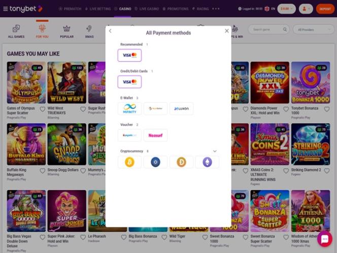 TonyBet 賭場由 Microgaming, Net Entertainment, Playtech, BetSoft, 1x2gaming, Amatic Industries, Big Time Gaming, ELK Studios, Evolution Gaming, EYECON, Ezugi, Habanero Systems, iSoftBet, lightningboxgames, Novomatic, Oryx, Play'n GO, playson, Quickspin, Rabcat, Relax Gaming, Thunderkick, Yggdrasil, Endorphina, Wazdan, Realistic Games, GameArt, Betgames, Booming Games, Pragmatic Play, Nolimit City, Red Tiger Gaming, Booongo, LuckyStreak, Spinomenal, Felix Gaming, Red Rake Gaming, Fugaso, Belatra Games, Fantasma Games, Kalamba, Platipus Gaming, Nucleus Gaming, Skywind, Spadegaming, Triple Edge Studios, BGAMING, Northern Lights Gaming, Evoplay, Stormcraft Studios, IGTech, Switch Studios, OneTouch, Electric Elephant Games, Pocket Games Soft, Bulletproof Games, Gluck Games, Mascot Gaming, TVBet, NetGame Entertainment, Gameburger Studios, Pulse 8 Studios, Slot Factory, Neon Valley Studios, Golden Rock Studios, Swintt, TrueLab Games, SpinPlay Games, Mancala Gaming, SmartSoft Gaming, Atmosfera, Real Dealer Studios, GONG Gaming, Caleta Gaming, Games Global, Reevo, 2by2 Gaming, Blueprint Gaming, CT Interactive, Greentube, Igrosoft, Merkur Gaming, Push Gaming, Tom Horn Gaming, Gamomat, Mr Slotty, Reel Time Gaming, Authentic Gaming, BF Games, Iron Dog Studio, Foxium, Just For The Win, Reflex Gaming, PearFiction Studios, Wild Streak Gaming, Slingshot Studios, Golden Hero, Fortune Factory Studios, Jade Rabbit Gaming, RubyPlay, 4ThePlayer, Gamevy, Crazy Tooth Studio, High 5 Games, Groove Gaming, ReelPlay, Japan Technicals Games, Alchemy Gaming, Black Pudding Games, Snowborn Games, Boomerang Studios, Hacksaw Gaming, Gold Coin Studios, Bang Bang Games, Gamzix, Arcadem, Slotmill, Triple Cherry, SilverBack Gaming, Peter And Sons, Absolute Live Gaming, Aurum Signature Studios, Charismatic, Onlyplay, Gamebeat, GoldenRace, TaDa Gaming, Winfinity, 3 Oaks Gaming, Amigo Gaming, Apparat Gaming, Spribe, Print Studios, 1spin4win, Bet2Tech, Gaming Corps, BetSolutions, Four Leaf Gaming, INO Games, Nailed It! Games, Neko Games, Reel Kingdom, Oros Gaming, Indigo Magic, Popiplay, Zillion Games, ICONIC21, Galaxsys and Turbo Games提供支持,該網站採用網頁平台,可透過您常用的瀏覽器存取。該網站還內建了行動相容性,方便您在智慧型手機和平板電腦上進行博彩。