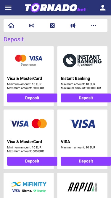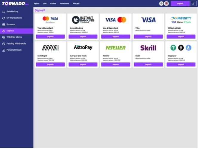 下面您可以找到 TornadoBet Casino 提供的存款和提款方式選擇: