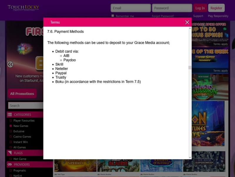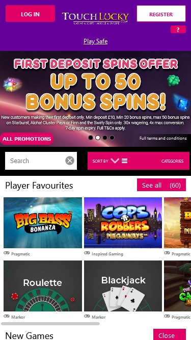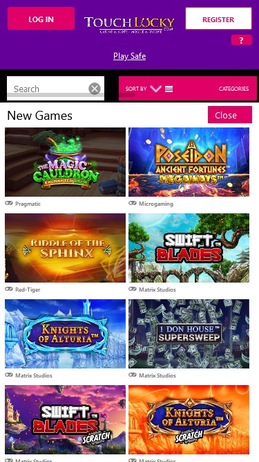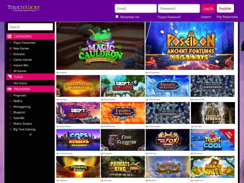 Touch Lucky Casino 由 Microgaming, Net Entertainment, Big Time Gaming, ELK Studios, Evolution Gaming, EYECON, lightningboxgames, Yggdrasil, Realistic Games, Pragmatic Play, Red Tiger Gaming, IGT, Games Global, Blueprint Gaming, Merkur Gaming, Nektan, NextGen, NYX Interactive, Inspired Gaming, Scientific Games, Iron Dog Studio, Foxium, The Games Company and Rocksalt Interactive提供支持,其遊戲透過即時播放平台提供,您可以透過行動裝置的網路瀏覽器直接存取。