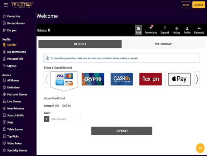 Tradition Casino 由 BetSoft, Genesis Gaming, Rival, Saucify, Vivo Gaming, Spinomenal, Felix Gaming, Fugaso, Radi8 Games, Fresh Deck Studios, Woohoo Games, Qora Games, SmartSoft Gaming, Tom Horn Gaming, Genii, Wager Gaming, Dragon Gaming and Dragoon Soft提供支持,其軟體可透過下載版或網頁版即時遊戲平台訪問,兩者操作方式相同。目前,該賭場不支援行動端遊戲。其他遊戲