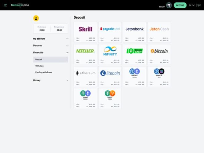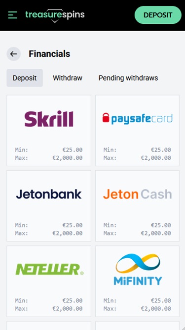 Banking銀⾏業務選項 的 Treasure Spins Casino