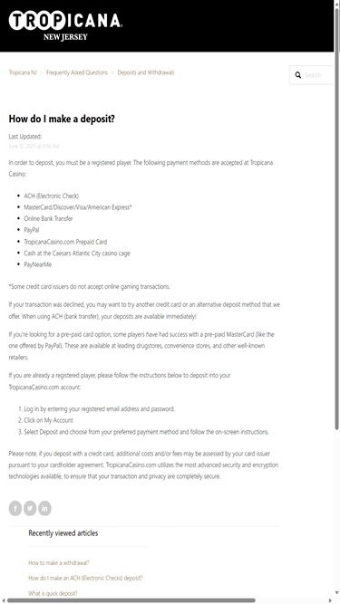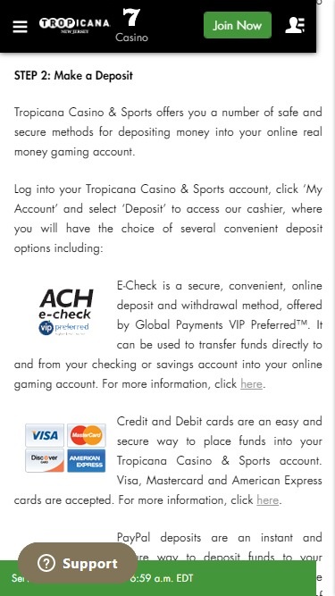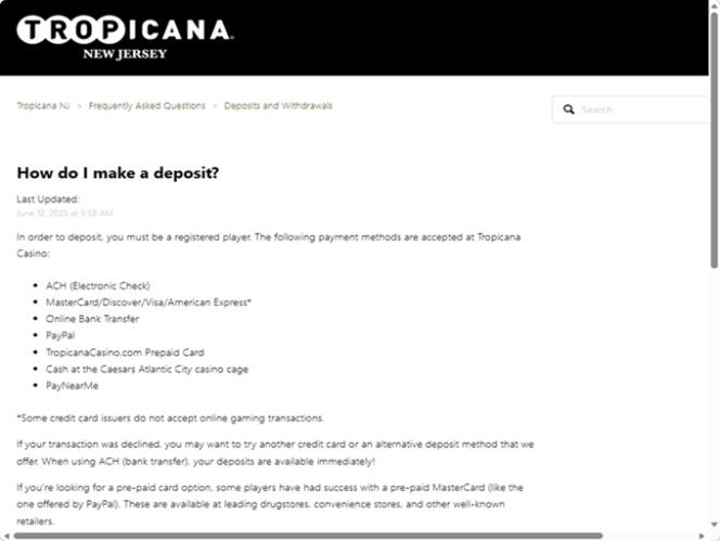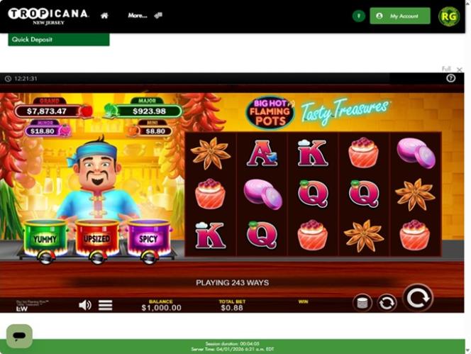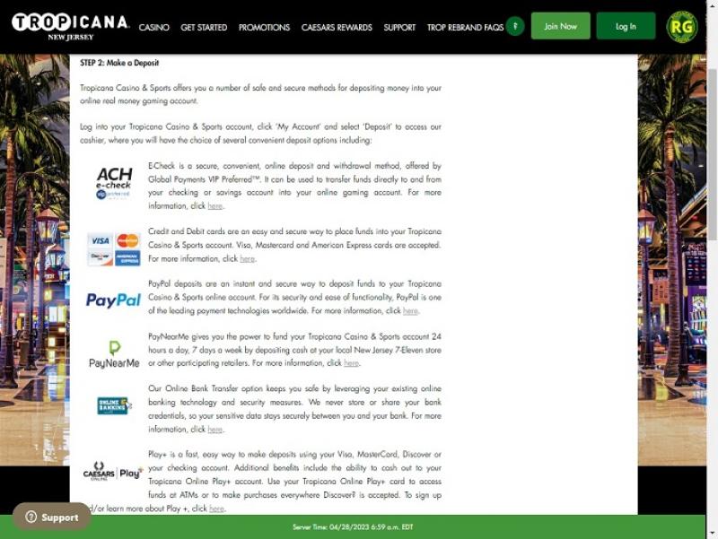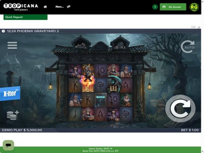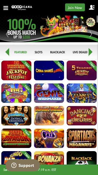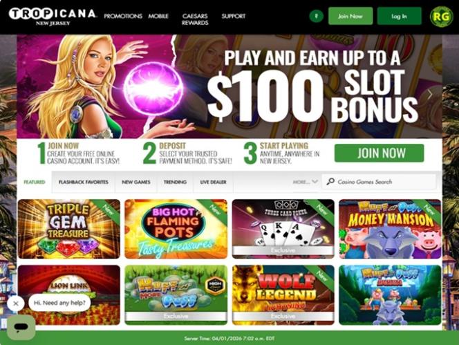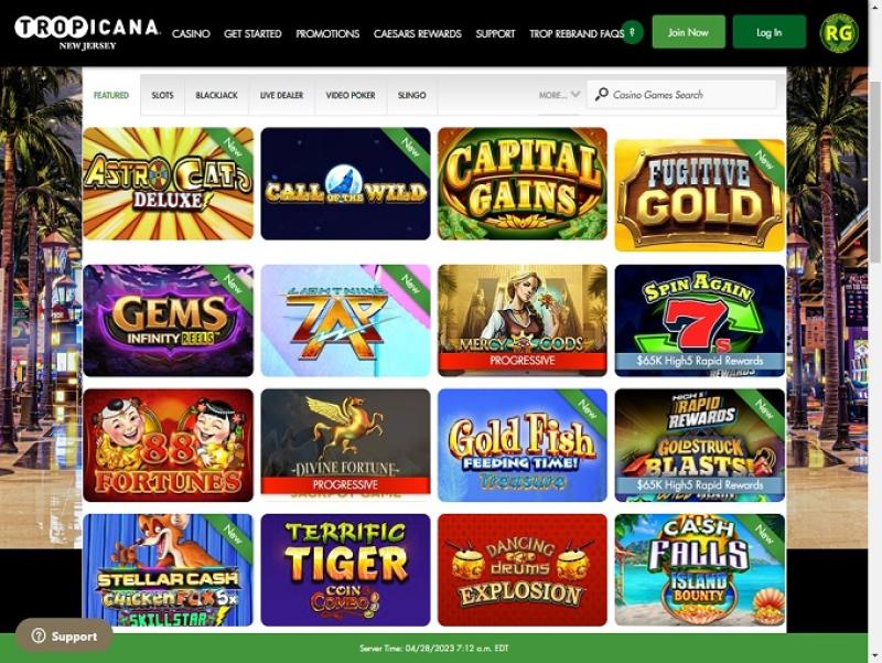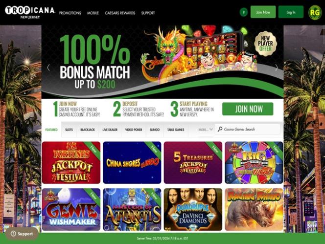 熱帶賭場 (Tropicana Casino) 是一家位於木板路旁的賭場,於 1981 年開業,為顧客提供老哈瓦那風格的體驗。除了賭場之外,該賭場還擁有超過 2,400 間酒店客房和一個設施齊全的娛樂中心。線上博彩是在新澤西州授權線上投注之後出現的,自那時起,熱帶賭場就一直為客戶提供自己的平台。要在熱帶賭場線上投注,投注者必須年滿 21 歲,並且實際位於該州境內。賭場資訊