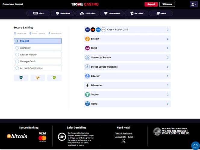 這裡最酷的功能之一是可以使用比特幣存款。加密貨幣支付越來越流行,很高興看到 True Poker 也加入進來,讓交易更快、更匿名。如果您不喜歡加密貨幣,他們仍然提供信用卡等傳統支付方式,讓您擁有更多選擇。