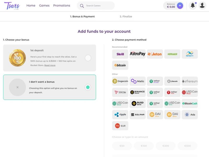 下面您將看到 Tsars Casino 的各種存款和提款選項。