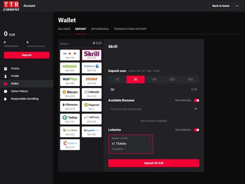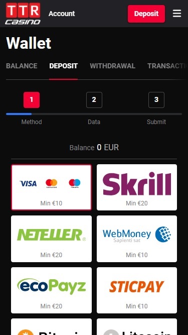 瀏覽了 TTR 賭場的條款和條件,我發現沒有什麼特別之處。 TTR 賭場的銀行系統非常出色,使用比特幣存款和提款幾乎可以即時處理。此外,還支援 SOFORT、Visa、Skrill 和 Neteller 進行存款和提款,同時也可以透過 MasterCard 和 Paysafecard 進行存款。提款也可以透過銀行轉帳進行。