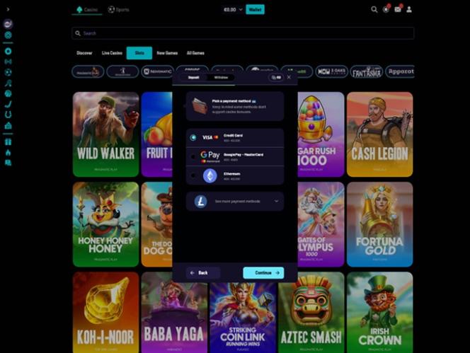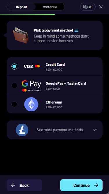 正如我們之前提到的,這是一個加密貨幣友好的線上賭場,這意味著您可以在這裡使用流行的加密貨幣支付選項進行支付,但也可以依靠一些傳統選項,例如銀行電匯、Google Pay、Revolut、Interac以及流行的信用卡和借記卡。