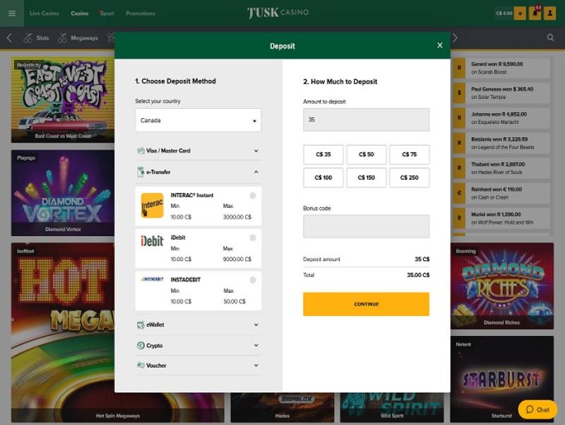在這裡您可以找到 Tusk Casino 的銀行業務選項,包括存款和提款方式。