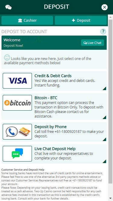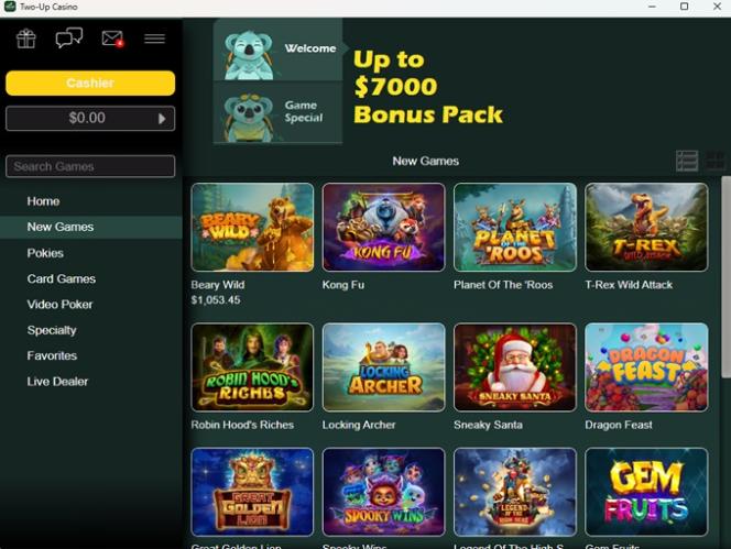 Two-Up Casino 由 Real Time Gaming, Visionary iGaming and Spinlogic Gaming提供支持,其遊戲透過基於網頁的即時遊戲平台提供,無需下載任何繁瑣的軟體到電腦硬碟。該網站還全面支援行動裝置遊戲,這意味著您可以透過智慧型手機或平板電腦存取您喜愛的老虎機遊戲。