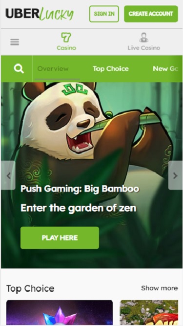 歡迎頁面顯示一個註冊框,並簡要介紹了歡迎獎金。點擊右上角的主頁圖標,即可進入賭場主頁。 Uberlucky 賭場採用現代簡約的設計,搭配明亮鮮豔的綠色。佈局簡潔,導航便捷,資訊分類清晰。正因如此,遊戲和賭場大廳成為絕對的焦點。