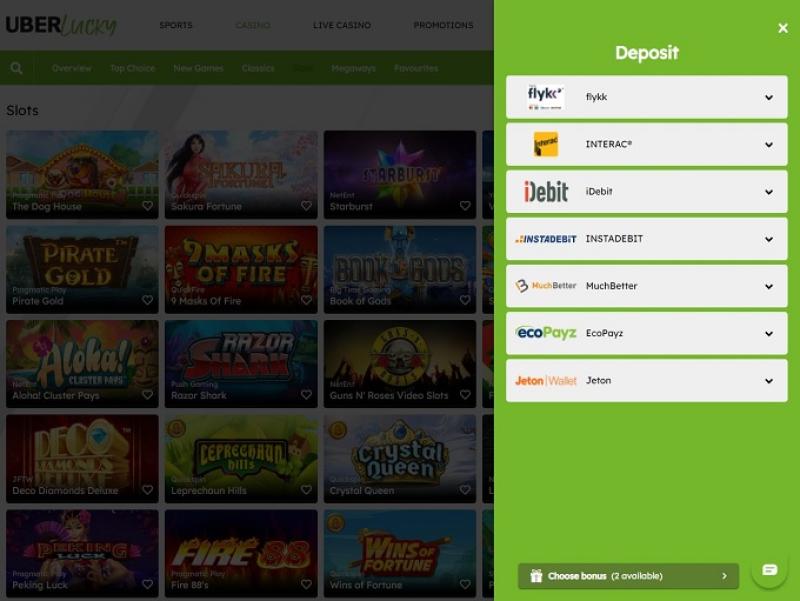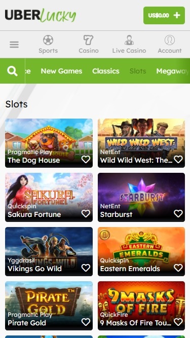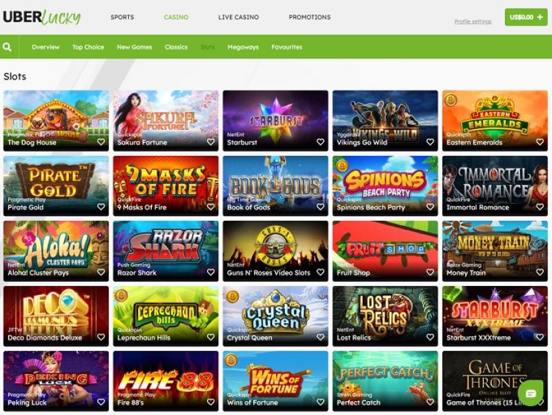 目前,UberLucky 提供體育博彩、老虎機遊戲和真人荷官賭場遊戲(遊戲節目、撲克、百家樂、二十一點和輪盤賭、瘋狂時光、現場擲骰子、一擲千金、現場閃電輪盤賭、Gonzo's Treasure Hunt、閃電骰子、現場沉浸式輪盤賭、現場足球工作室、終極德州撲克、現場大富翁、捕夢網、強力二十一點、現場輪盤賭、超級球、現場閃電輪盤賭、自動速度輪盤賭),但虛擬桌面遊戲目前不包含在賭場優惠中。