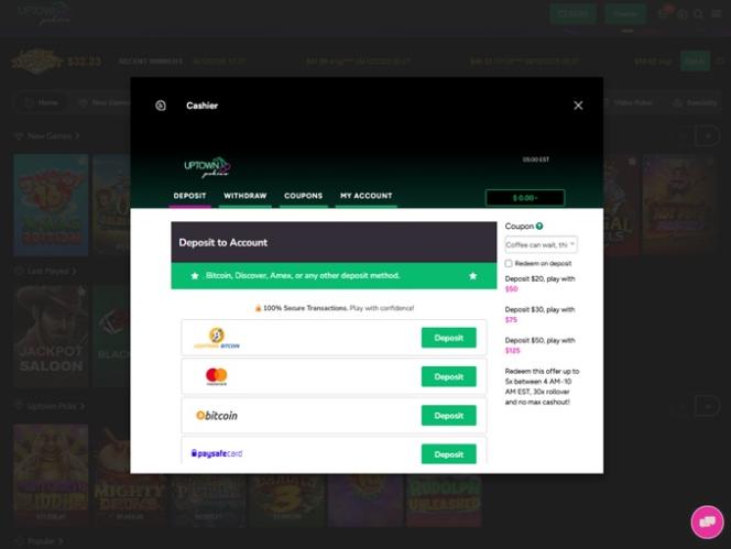 Uptown Pokies 由 Real Time Gaming and Spinlogic Gaming提供支持,賭場遊戲透過網頁即時遊戲平台提供。網站擁有大型遊戲縮圖,瀏覽體驗極佳。此外,網站也支援行動裝置遊戲,方便在智慧型手機和平板電腦上暢玩。