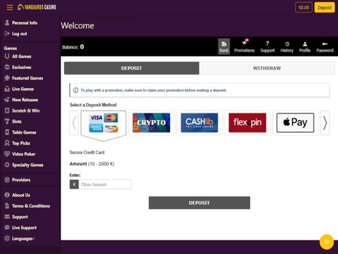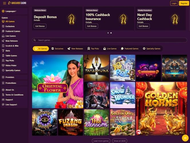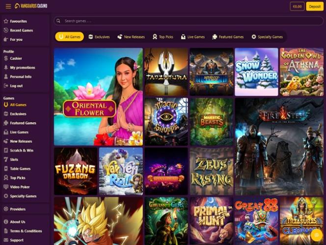 Vanguard Casino 由 BetSoft, Genesis Gaming, Rival, Saucify, Vivo Gaming, Spinomenal, Felix Gaming, Radi8 Games, Fresh Deck Studios, Woohoo Games, Qora Games, SmartSoft Gaming, Tom Horn Gaming, Genii, Wager Gaming, Dragon Gaming and Dragoon Soft提供支持,賭場遊戲可透過下載軟體或網頁即時遊戲平台進行。此外,Vanguard Casino 還支援行動裝置遊戲,讓您隨時隨地暢玩各種遊戲。其他遊戲