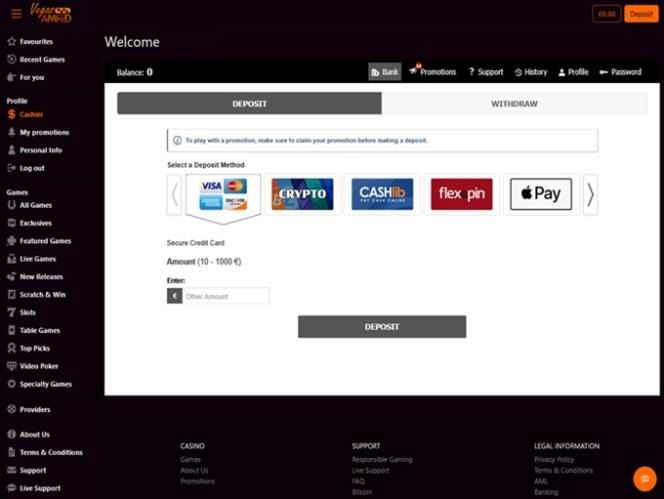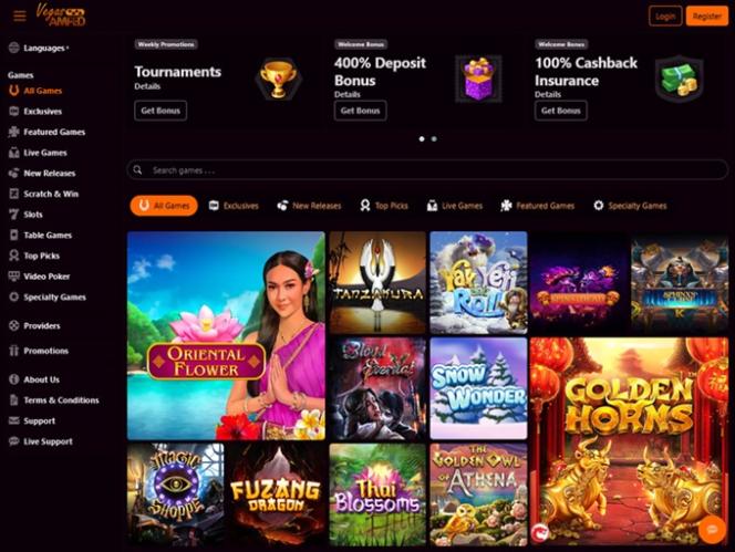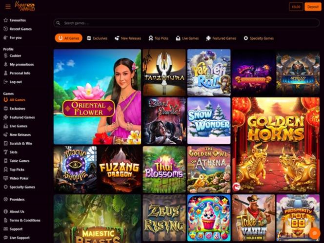 Vegas Amped Casino 由 BetSoft, Genesis Gaming, Rival, Saucify, Vivo Gaming, Spinomenal, Felix Gaming, Fugaso, Radi8 Games, Fresh Deck Studios, Woohoo Games, Qora Games, SmartSoft Gaming, Tom Horn Gaming, Genii, Wager Gaming, Dragon Gaming and Dragoon Soft提供支持,其遊戲透過可下載的軟體以及基於網頁的即時遊戲平台提供。該賭場還支援行動端遊戲,讓您有機會在任何有數據訊號的地方暢玩。其他遊戲