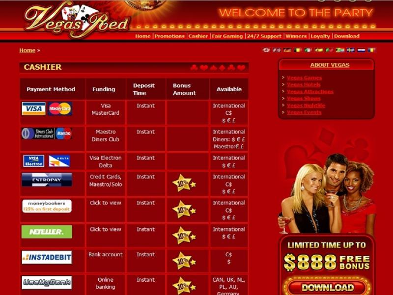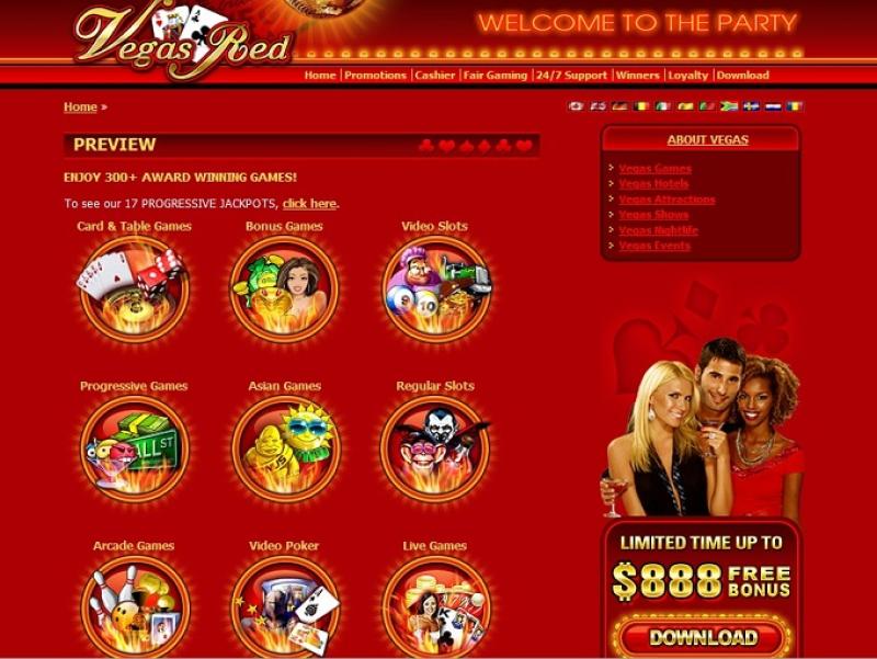 拉斯維加斯紅賭場 (Vegas Red Casino) 以紅色為主色調,擁有賞心悅目的介面。該網站自2002年運營,由 Europartners 集團擁有。