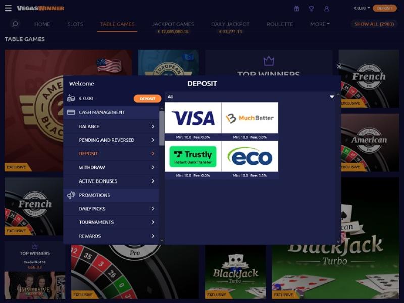VegasWinner 賭場由 Amaya, Microgaming, Net Entertainment, Playtech, 1x2gaming, Barcrest, Big Time Gaming, ELK Studios, Evolution Gaming, EYECON, lightningboxgames, Oryx, Play'n GO, Quickspin, Rabcat, Relax Gaming, Thunderkick, Yggdrasil, Wazdan, Realistic Games, Booming Games, Stakelogic, Pragmatic Play, Nolimit City, Red Tiger Gaming, Fantasma Games, Kalamba, Spin Games, Triple Edge Studios, Northern Lights Gaming, Stormcraft Studios, Switch Studios, Electric Elephant Games, Bulletproof Games, All41 Studios, Gluck Games, Gameburger Studios, Pulse 8 Studios, Neon Valley Studios, Golden Rock Studios, Spearhead Studios, Shuffle Master, SpinPlay Games, GONG Gaming, Blue Guru Games, Lady Luck Games, Buck Stakes Entertainment, Games Global, Amusnet Interactive, 2by2 Gaming, Ash Gaming, Bally Technologies, bluberi, Blueprint Gaming, EveryMatrix, GamesOS, Merkur Gaming, NextGen, Skill on Net, WMS, Inspired Gaming, Cayetano, SG Interactive, Gamomat, Red7Mobile, Scientific Games, Side City Studios, Reel Time Gaming, Authentic Gaming, Bally Wulff, Iron Dog Studio, Old Skool Studios, Foxium, Betdigital, Just For The Win, Reflex Gaming, Storm Gaming Technology, PearFiction Studios, Wild Streak Gaming, Slingshot Studios, Golden Hero, Fortune Factory Studios, STHLM Gaming, 4ThePlayer, AvatarUX, Gamevy, Crazy Tooth Studio, ReelPlay, Japan Technicals Games, Alchemy Gaming, Rarestone Gaming, BB Games, Black Pudding Games, Snowborn Games, Boomerang Studios, Hacksaw Gaming, Max Win Gaming, Gold Coin Studios, Bang Bang Games, Half Pixel Studios, SilverBack Gaming, Peter And Sons, Eurostar Studios, Aurum Signature Studios, Armadillo Studios, Lucksome Gaming, Area Vegas, Wishbone Games and Circular Arrow提供支持,其遊戲透過基於網頁的即時遊戲平台提供,玩家可以直接透過網路瀏覽器註冊、存款、遊戲和提現。該賭場也支援行動端遊戲,玩家可以透過智慧型手機或平板電腦在任何有穩定數據連接的地方投注。Slots