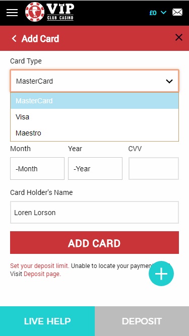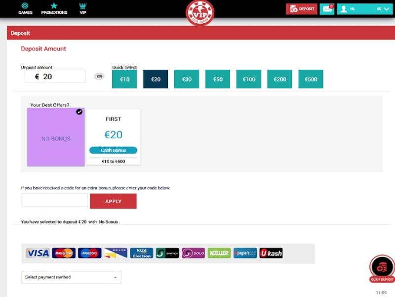 VIP俱樂部的銀行系統相當完善,接受Visa、ecoPayz、Boku、Skrill、MasterCard、Maestro、Eco、Neteller、Solo、Diners和Click2Pay等卡的存款和提款。賭場的每週存款限額為1,500英鎊,提款限額為3,000英鎊,玩家預計支付需要7-10天才能到帳。Banking銀⾏業務選項 的 VIP Club Casino