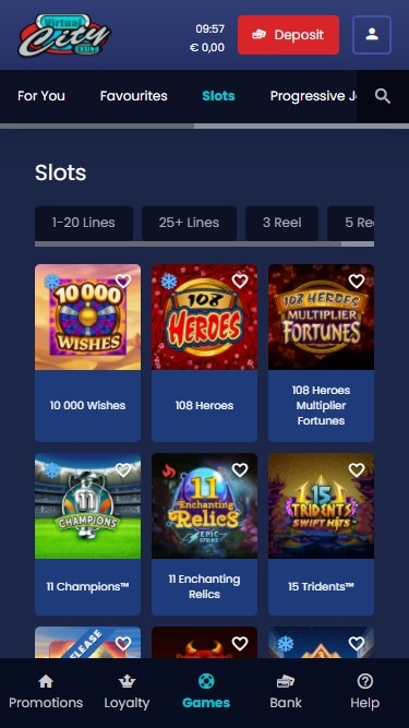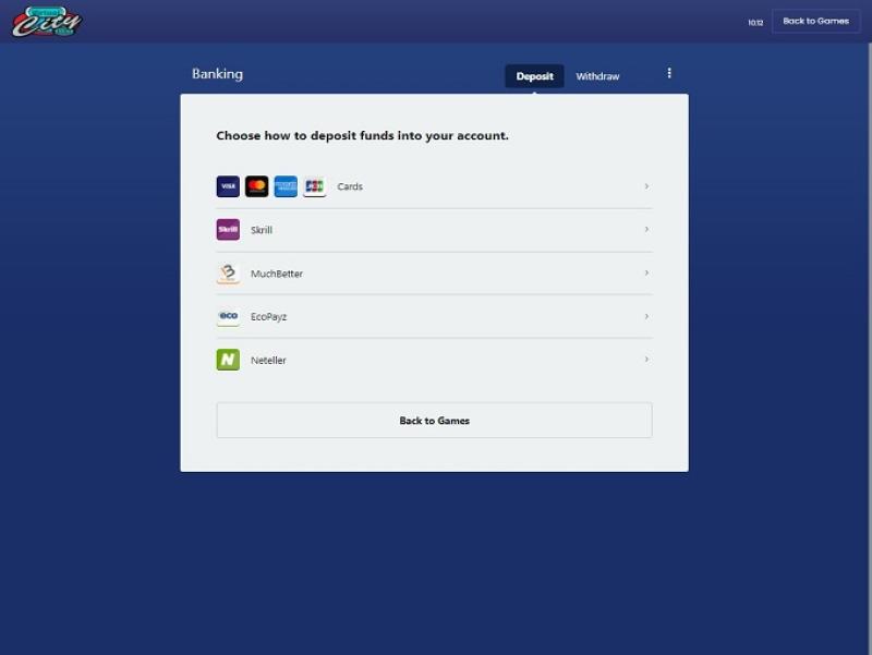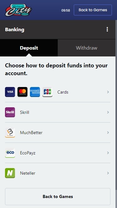 Virtual City Casino 由 Microgaming, Evolution Gaming, Rabcat, Triple Edge Studios, Stormcraft Studios, All41 Studios, Gameburger Studios, Neon Valley Studios, On Air Entertainment, Games Global, Foxium, Just For The Win and Slingshot Studios提供支持,提供數百款賭場遊戲以及穩定安全的遊戲平台。想要在 Virtual City Casino 玩遊戲的玩家可以透過網頁平台進行遊戲,也可以直接下載並安裝軟體到電腦上。使用智慧型手機或平板電腦的玩家可以透過 Virtual City 的行動網站玩遊戲。Baccarat