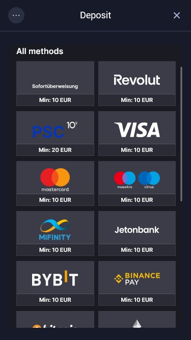 付款方式多種多樣,包括 Visa、Mastercard、 Revolut 、 Paysafecard 、Jeton、銀行電匯、 MiFinity和Neteller等熱門選項,以及比特幣、狗狗幣、以太坊、萊特幣、 Toncoin 、Tron、 USD Coin和Tether等多種加密貨幣。