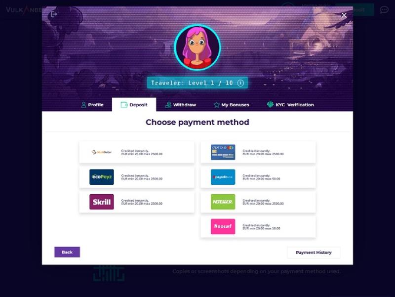 Vulkanbet 的銀行系統相當不錯,但支付需要 48 小時才能到達。您可以使用銀行卡和電子錢包來處理存款和提款。