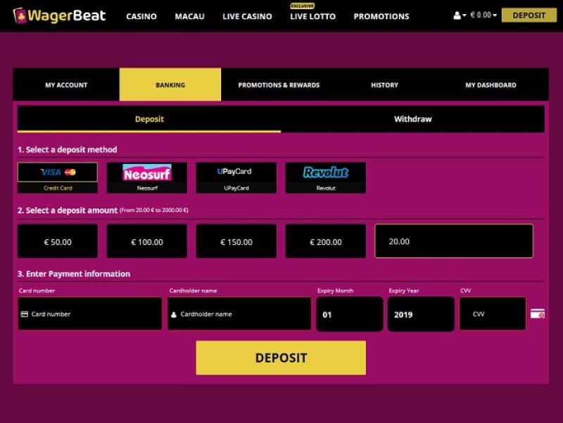 Wager Beat Casino 是一個線上博弈網站,為全球玩家提供網路博彩服務。該網站擁有美觀的介面和豐富的遊戲選擇。雖然這家賭場並非我們見過的最好的,但它絕對是一個值得一玩的地方。如果您正在尋找新的賭場,我們強烈推薦它。
