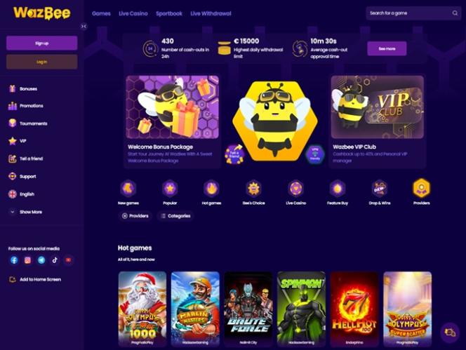 Wazbee Casino 於 2023 年上線,打造了一個龐大的博彩網站,為幾乎所有類型的玩家提供豐富的體育博彩和遊戲選擇,包括線上老虎機、真人荷官、速成遊戲和桌面遊戲。憑藉其出色的促銷計劃、極快的提現速度以及創新的「即時提現」功能,我們毫不奇怪為什麼這麼多玩家選擇這個品牌!