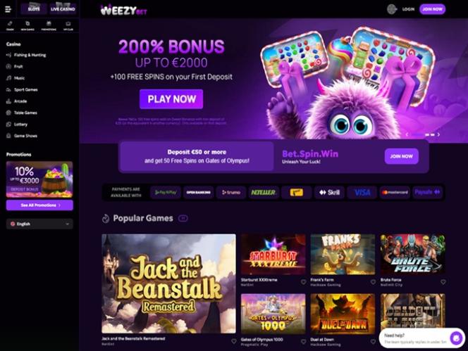 WeezyBet.com 是一家由科摩羅聯盟昂儒昂自治島政府監管並頒發執照的線上賭場。該運營商主要服務芬蘭、丹麥、德國、荷蘭、義大利、希臘和加拿大的玩家。即使您來自其他博彩管轄區,也請繼續關注,因為這個品牌給人的第一印象非常誘人。