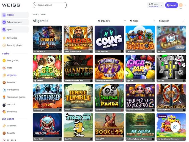 在 Weiss Casino,您可以選擇玩一些精彩的線上老虎機遊戲,例如Money Train 3、Midas Golden Touch、Temple Tumble、Triple Panda、Dork Unit、Farmland Frenzy Maxways、Story of Odin、Razor Shark等等。